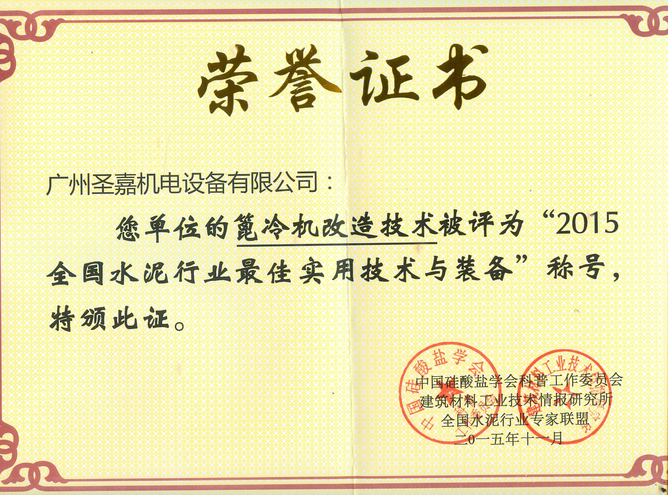 廣州圣嘉機電設備有限公司的篦冷機改造技術在由中國硅酸鹽學會科普工作委員會、建筑材料工業(yè)技術情報研究所、全國水泥行業(yè)專家聯(lián)盟舉辦的2015年“中國水泥技術年會暨全國水泥技術交流大會”上榮獲全國水泥工業(yè)最佳實用技術(BAT),獲得獎牌并在中國建材報上公示,同時入選收錄在由謝克平教授編寫的“高性價比水泥裝備動態(tài)集錦”一書中。